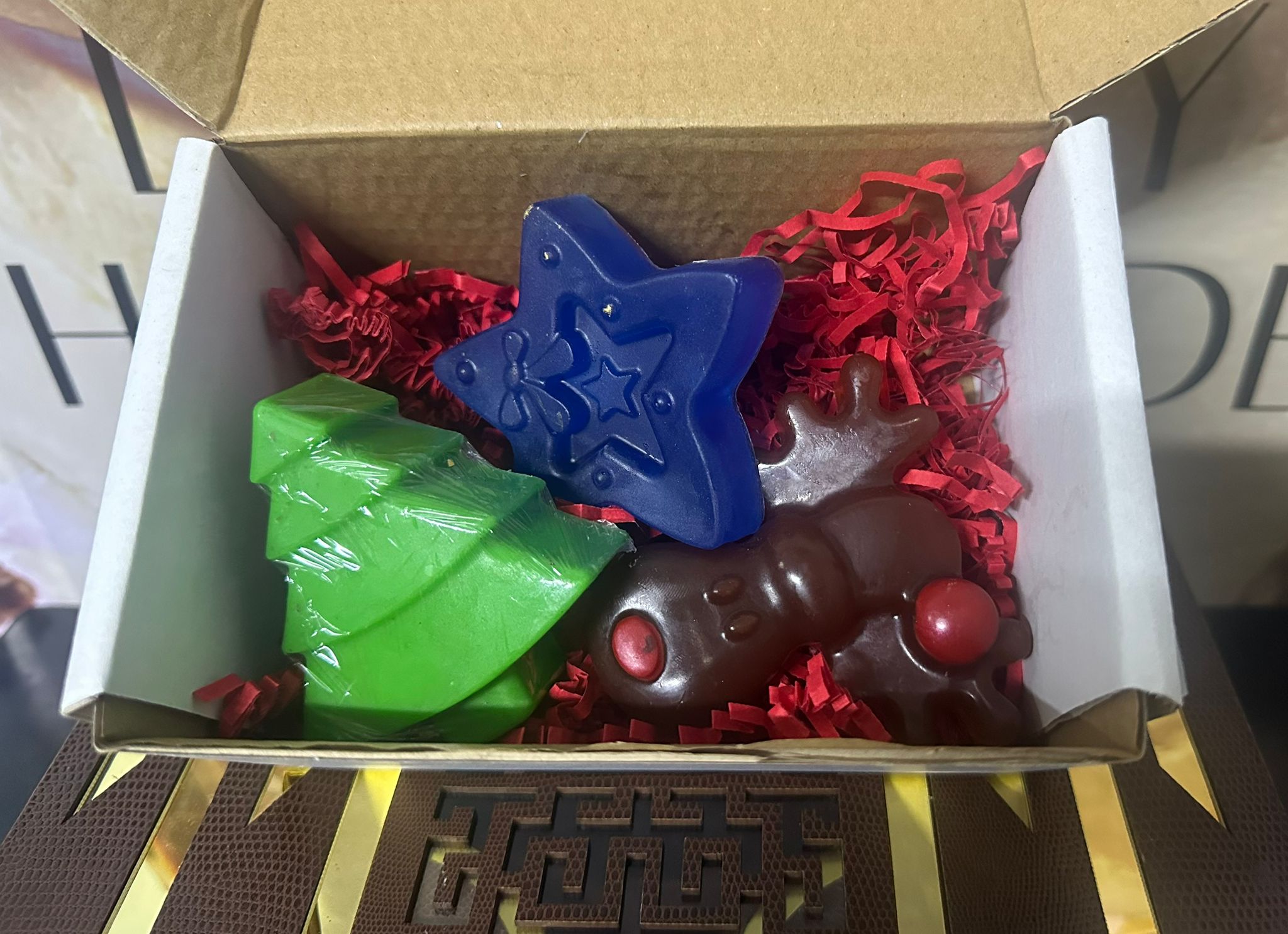 Grey box contains 3 Christmas soaps